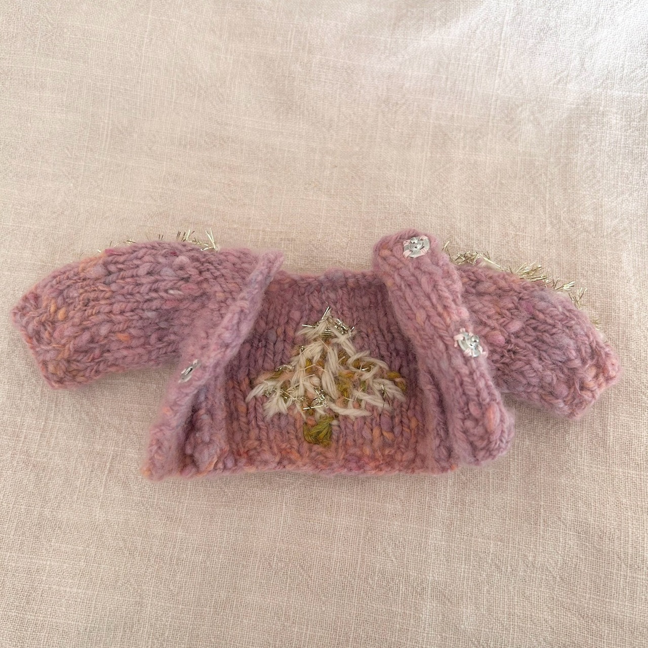 Hand-spun yarn is used, and because the yarn thickness is uneven, the width of the cuffs may differ between the left and right sleeves.